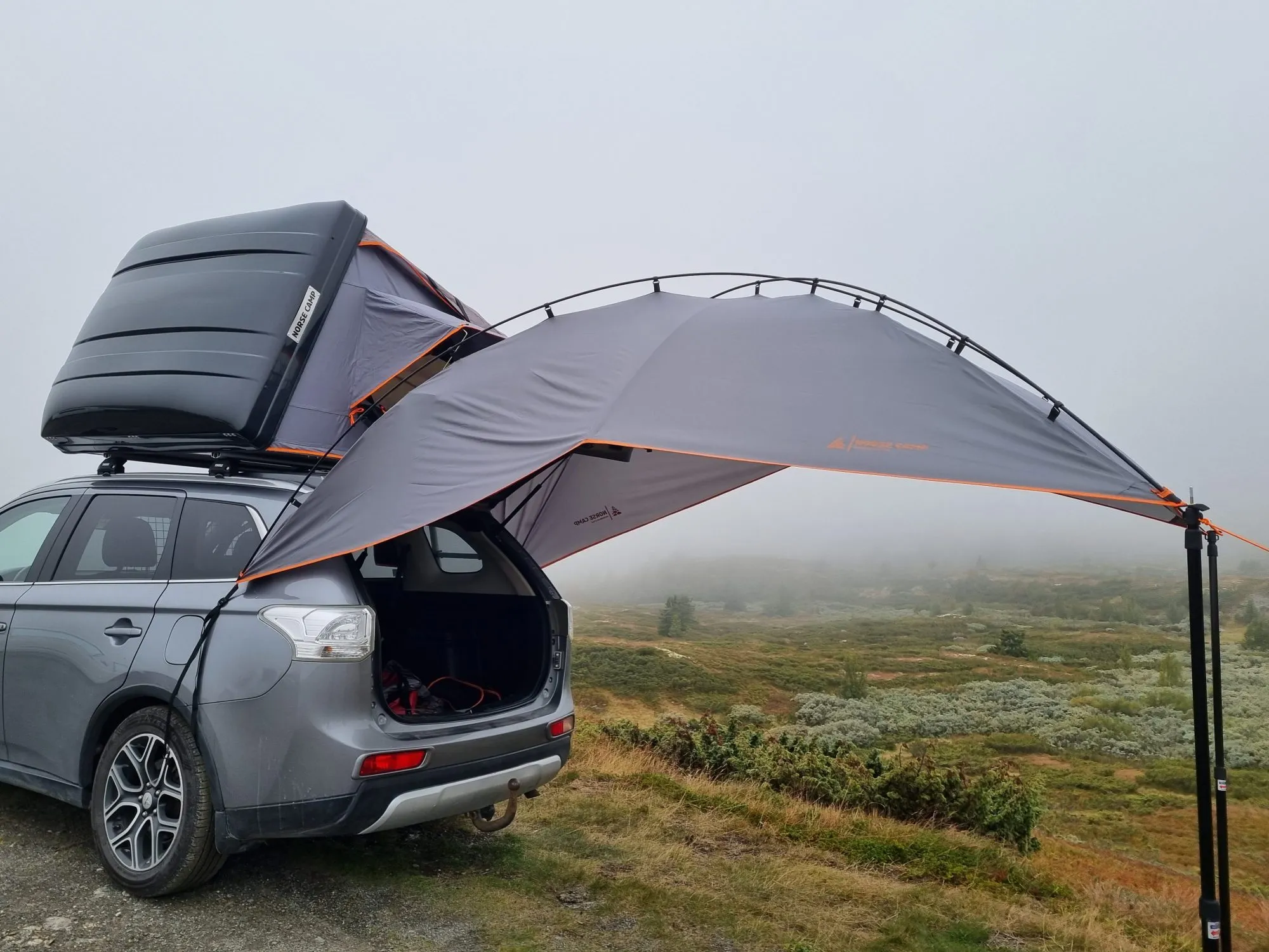 Stříšku nad zadními dveřmi lze snadno připevnit za většinu automobilů tak, že ji připevníte ke kolům na obou stranách a umístíte na zadní dveře. Přední stojany s pevnými teleskopickými tyčemi, které jsou bezpečně zapuštěny do země. Je neuvěřitelně snadno sbalitelný a velmi dobře funguje i v kombinaci se střešními stany NORSE. Obdržíte ji ve dvou praktických kapsách.